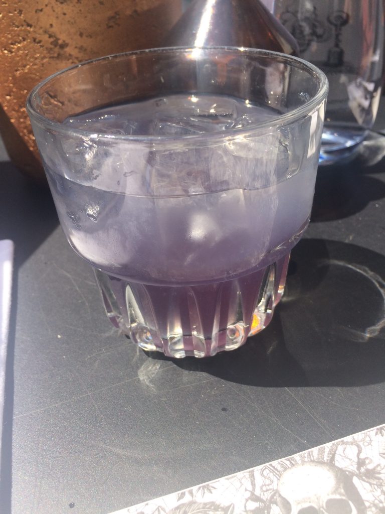 … I shall drink purple. This is called a Black Jack, a rum-based cocktail at Alchemist in Leeds. Pour over the ice, then squirt something out of a syringe onto it. Meh.